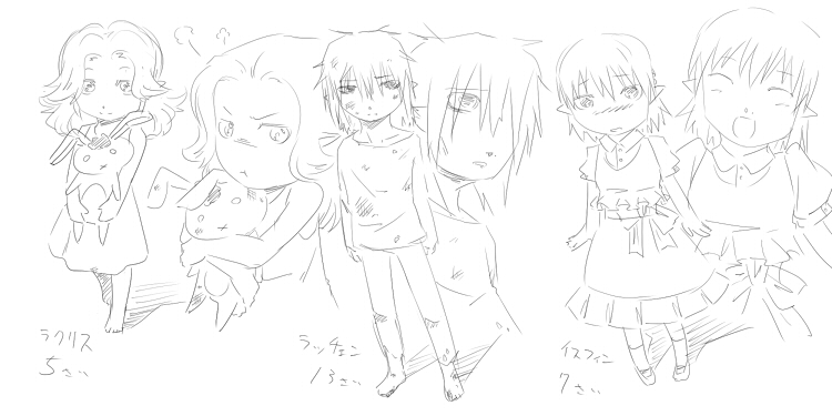 今回はページ数とか気にせずに気楽に描いてみようかとーっ たぶん32pとかに纏めるとテンポ早すぎて着いていけない感じになりそなので・・・ 気付いてる人は気付いてるかもしれない、いつもの隠しページにラフうpしてまっす。 字が汚すぎて目が潰れても良いという人は自己責任でどうぞ(!? ↓11/23リンク先変更。 http://kyle712.ninja-web.net/mnm1_1.html 最近ラフがゴチャゴチャし過ぎないくらいにサックリ描けるようになったので、どういうシーンか分かる程度にはなってる・・・と思います。 とりあえず、ヒューとシトリンの登場シーンまで。 にゃんこ描くの難しいよ!ケット・シーの顔が未だに安定しませんぬ。(´・ω・`) どうでもいいけど、今までブラシのサイズ7で描いてたんだけど3に変えました。 これまで主線が煩過ぎたのが少し解消された気がします。もっと早く気付けって話ですねw 仕事行ってきまs・・・orz 凹んできた・・・厳しいのは分かってたけど、やっぱり無理かな・・・時間が無くなってきた;; あちゃー・・・気が付いたら1週間以上ブログさぼってた;; |