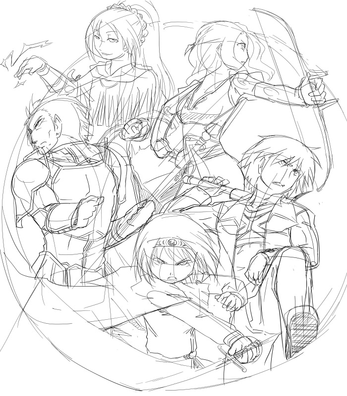 元々鼻炎持ちで気管も弱いから、埃っぽい今の職場環境も影響してるのかもしれないけど、鼻水鼻づまり止まらない咳でせっかくの休みが台無しにされた!がっでむ!! まぁ、こんな憎まれ口叩けるくらいにはもう元気ですがね! さて以前からよその子さん集合絵描く描くいってましたけど、期間空き過ぎて前回の構図が何だか自分で気に入らなくなってきたので、また描き直してます。 3枚くらいラフ描いてその中から選んだのがコレ↓ ペン入れが自分にとっては苦行過ぎるので、また心がポッキンする前に線画までは終わらせたひですねぇー・・・ Aさん、せっかく背面図まで描いて下さったのに、前向いちゃいましたすみまっせーん;; タイトルも入れたかったけど、そんなスペース無くなっちゃったなぁー・・・左下に入れてみるかな。 最近絵を描く時間が余り取れてないので、この後にも描きたい絵はあるんですが、全部消化できるかしらん・・・。 そんな新キャラ二人組。 セオボルト(右)とユウェン(左) セオボルト 人間とオウガ、3:1のクォーター。 年は20代前半、人間と同様に年を取る。 外見は人間と変わらない。小柄な肉体と容貌に不釣り合いな程、屈強で凄まじい怪力を持つ。 身長が低い。163cmだが筋肉量が多いので体重は70kg前後。 頑丈で重量のある武器を好んで用いる。軽量の武器はすぐに壊れるから嫌い。 鬼(オウガ)の血を引いているが素性を隠し、人間社会に溶け込んで生活している。 主に魔物討伐等の比較的危険な依頼を請け負う凄腕のモン○ターハンター。自身も魔物と人間の混血であるが討伐対象に対して一切の仲間意識や情は無い。 むしろ、魔物が人間に害を成す所為で自分までが危険視されるので、魔物退治に対して割と積極的だったりする。 単細胞で直情的、プライドが高く怒りっぽい。思った事がそのまま口からダダ漏れする人。 生意気だけどそこそこ良いヤツ。 感情のコントロールが上手く出来ず、昂り過ぎるとキレる。付いた二つ名がバーサーカー。 この状態になると額に二本の角が生え、体色が赤黒く変化する。理性も失われているので、落ち着きを取り戻すまでひたすら暴れまわる。 過去にヒュー達とパーティーを組んでいた時期がある。 出会った当初は「魔物をむやみに殺すな」というヒューの考えに苛立ちを覚えていた。 が、一度だけ依頼の途中で鬼化してしまった事があり、その際に敵味方も分からず襲い掛かる状態の自分を殺さず、変身状態が解けるまでまで相手し続けたヒューの行動に心を動かされる。(ユウェン曰く、殺そうと思えば何度も出来たしそれが一番楽だったけど、どんなに傷だらけになって追いつめられてもヒューは剣を抜かなかった、との事) 以来、改心出来そうな相手に対しては歩み寄りの姿勢を見せる様になった。 パーティー内ではセオ(Theo)と名乗っていた。 ユウェン ダークエルフの血を引いている。 その血は薄れ切って種の特徴は殆ど見受けられない。が、右目がダークエルフ特有の琥珀色をしている為眼帯で隠している。魔法も若干使えるが勿論、人前で使ったりはしない。 年は20代半ば、こちらも人間同様に年を取る。 高身長で痩身。182cm、60kg弱で横にセオボルトが並ぶと残念な事になる。 いつも無表情でちょっと怖い。 口数は少ない(しかも棒読み)が、ネガティブ思考の持ち主なので稀に発せられる言葉は割と辛辣。 感情が言葉よりも態度に出るタイプ。 気に入らない事があるとわざとらしい位の大きな溜め息をつく。また、落ち着かないと親指の爪を噛む癖がある。 モンスター討伐の依頼の他にも様々な依頼を請け負うマルチハンター。 右眼の事を詮索されるのが煩わしいので単独で活動していたが、馬が合ったセオボルトといつしか行動を共にする事が多くなった。(混血である都合上、お互い相手を詮索し合わなかった為) 余所に注意を引かれている相手に背後から近付き、暗器で急所を一撃する暗殺に近い戦い方。 ヒューと出会い、セオボルトが人魔の共存を目指す様になってからは、極力殺しはしていない。 パーティー内ではイーゥ(Ew)と名乗っていた。
