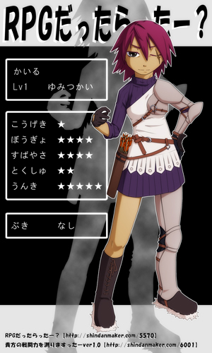 × [PR]上記の広告は3ヶ月以上新規記事投稿のないブログに表示されています。新しい記事を書く事で広告が消えます。 野狸さんトコの絵チャにお邪魔してきました! フリフリにしとけば何となく豪華に見えるよね!とかそんな安直な考えなので、まぁ・・・正直、そんな変わって無いかもですw ちなみにフェアリーは過去にデザインしたものをリデザしたものでs それから面白そうなの見っけたので、こんなのもやってみました。 RPGだったらったー? 蒼美海流さんは『隠しキャラの弓使いで、外見は紅髪ショートヘアの隻眼、武器は素手で戦う』ようです。 http://shindanmaker.com/5570 ついでに貴方の戦闘力測りますったーver1.0 http://shindanmaker.com/6001 隠しキャラの癖に性能悪過ぎw 弓使いなのに素手で戦うとかどういうことなの!? 最後に、相互さんからバトン回して頂いてたんですが、多分これ全く同じ物やったことあると思うので、失礼ながら今回はスルーさせて頂きます。名前挙げてくださった方々ありがとうございましたぁ^^ PR