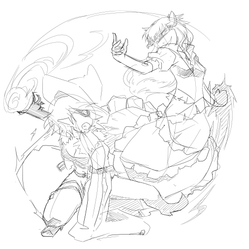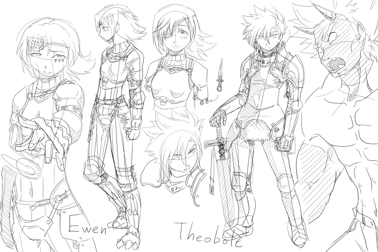 元々鼻炎持ちで気管も弱いから、埃っぽい今の職場環境も影響してるのかもしれないけど、鼻水鼻づまり止まらない咳でせっかくの休みが台無しにされた!がっでむ!! まぁ、こんな憎まれ口叩けるくらいにはもう元気ですがね! さて以前からよその子さん集合絵描く描くいってましたけど、期間空き過ぎて前回の構図が何だか自分で気に入らなくなってきたので、また描き直してます。 3枚くらいラフ描いてその中から選んだのがコレ↓ ペン入れが自分にとっては苦行過ぎるので、また心がポッキンする前に線画までは終わらせたひですねぇー・・・ Aさん、せっかく背面図まで描いて下さったのに、前向いちゃいましたすみまっせーん;; タイトルも入れたかったけど、そんなスペース無くなっちゃったなぁー・・・左下に入れてみるかな。 最近絵を描く時間が余り取れてないので、この後にも描きたい絵はあるんですが、全部消化できるかしらん・・・。 そんな新キャラ二人組。 セオボルト(右)とユウェン(左) セオボルト 人間とオウガ、3:1のクォーター。 年は20代前半、人間と同様に年を取る。 外見は人間と変わらない。小柄な肉体と容貌に不釣り合いな程、屈強で凄まじい怪力を持つ。 身長が低い。163cmだが筋肉量が多いので体重は70kg前後。 頑丈で重量のある武器を好んで用いる。軽量の武器はすぐに壊れるから嫌い。 鬼(オウガ)の血を引いているが素性を隠し、人間社会に溶け込んで生活している。 主に魔物討伐等の比較的危険な依頼を請け負う凄腕のモン○ターハンター。自身も魔物と人間の混血であるが討伐対象に対して一切の仲間意識や情は無い。 むしろ、魔物が人間に害を成す所為で自分までが危険視されるので、魔物退治に対して割と積極的だったりする。 単細胞で直情的、プライドが高く怒りっぽい。思った事がそのまま口からダダ漏れする人。 生意気だけどそこそこ良いヤツ。 感情のコントロールが上手く出来ず、昂り過ぎるとキレる。付いた二つ名がバーサーカー。 この状態になると額に二本の角が生え、体色が赤黒く変化する。理性も失われているので、落ち着きを取り戻すまでひたすら暴れまわる。 過去にヒュー達とパーティーを組んでいた時期がある。 出会った当初は「魔物をむやみに殺すな」というヒューの考えに苛立ちを覚えていた。 が、一度だけ依頼の途中で鬼化してしまった事があり、その際に敵味方も分からず襲い掛かる状態の自分を殺さず、変身状態が解けるまでまで相手し続けたヒューの行動に心を動かされる。(ユウェン曰く、殺そうと思えば何度も出来たしそれが一番楽だったけど、どんなに傷だらけになって追いつめられてもヒューは剣を抜かなかった、との事) 以来、改心出来そうな相手に対しては歩み寄りの姿勢を見せる様になった。 パーティー内ではセオ(Theo)と名乗っていた。 ユウェン ダークエルフの血を引いている。 その血は薄れ切って種の特徴は殆ど見受けられない。が、右目がダークエルフ特有の琥珀色をしている為眼帯で隠している。魔法も若干使えるが勿論、人前で使ったりはしない。 年は20代半ば、こちらも人間同様に年を取る。 高身長で痩身。182cm、60kg弱で横にセオボルトが並ぶと残念な事になる。 いつも無表情でちょっと怖い。 口数は少ない(しかも棒読み)が、ネガティブ思考の持ち主なので稀に発せられる言葉は割と辛辣。 感情が言葉よりも態度に出るタイプ。 気に入らない事があるとわざとらしい位の大きな溜め息をつく。また、落ち着かないと親指の爪を噛む癖がある。 モンスター討伐の依頼の他にも様々な依頼を請け負うマルチハンター。 右眼の事を詮索されるのが煩わしいので単独で活動していたが、馬が合ったセオボルトといつしか行動を共にする事が多くなった。(混血である都合上、お互い相手を詮索し合わなかった為) 余所に注意を引かれている相手に背後から近付き、暗器で急所を一撃する暗殺に近い戦い方。 ヒューと出会い、セオボルトが人魔の共存を目指す様になってからは、極力殺しはしていない。 パーティー内ではイーゥ(Ew)と名乗っていた。