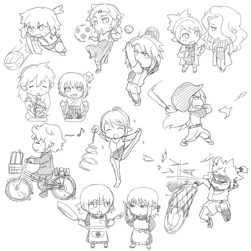 先日ぬこが熱中症になりましたけど、仕事場変わってからウチも体調がよろしくないです(´・ω・`) お腹は減ってるんだけど食べ物を口にする気が起きなくて、水分ばっかり摂ってます。あと慢性的に身体がダルいです。頭が働かないのはいつもの事ですが身体に力が入りませんー;; 疲れも溜まってるのか家に帰ったらいつの間にか寝ちゃってたりして、時間がもったいなくてイヤ。 少しは涼しくなってくれれば楽になりそうなんですが・・・できれば、それよりも先に職見つかってほしい・・・orz このキャラ部活とかやってたら何部だろう、とか。考えてたら結構楽しかったw 年齢とかは気にしてません。単なるノリですw 左上からラッチェン(バレー部)、ピューリー(サッカー部、多分助っ人)、ジェノ(テニス部)、チェリス(科学部)ラクリス(顧問)、ユリム、パルフェット(華道部)、ニヴヴ(新体操部)、ゼルト(野球部)、ディアノース(帰宅部、笑)、コーネル、イスフィン(家庭科部)、セネトア(バスケ部) スペース無かったから描けなかったけど、ラーファはアーチェリー、ストロベルはバドミントンとかやってそう、お爺ちゃんは書道部顧問とかかなー?ヴァンデルは何だろ、シャノンは・・・陸上部とか?w あと、仕上げられるか分かんない一枚絵ラフ。 ダフネvsイサ。 オルレーン神話の原点。 円状の構図って面白いですー、憧れの某絵師さんの影響なんですが・・・! 溜まってるイラスト近い内にうpしたいとかいってましたけど、今見直したら自分でもちょっときっついんで、数枚は没になりそうです。 内、一枚は元々暑中見舞いに描いた物だったんですが、ちょっと遅くなりすぎましたね・・・そろそろ、本家サイトの方も更新しないといけないですね;; 1カ月以上更新されてないですしー・・・orz